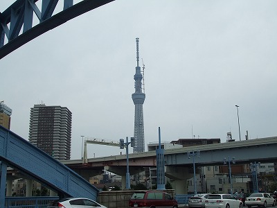 隅田川沿いを歩き、駒形橋の上からのスカイツリー。おぉ~ちゃんと、てっぺんまである~。