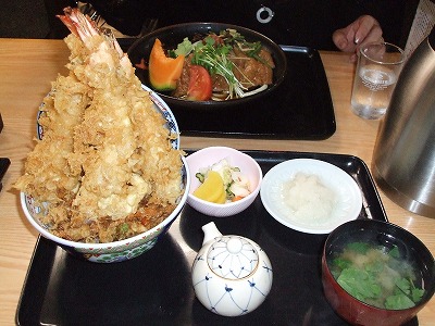 巨大な海老天とかきあげの入った、巨大などんぶりです。が、とても美味しくいただきました。